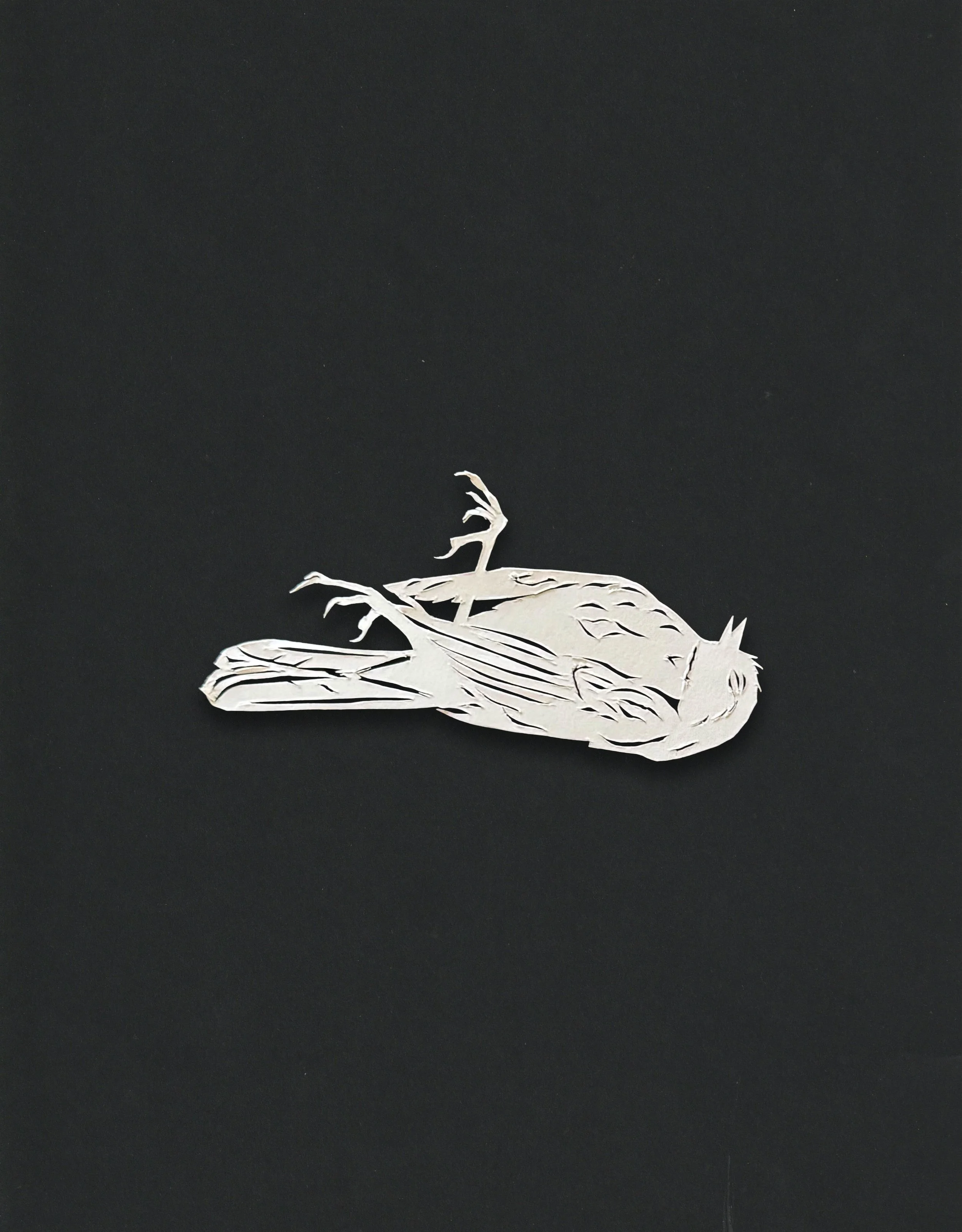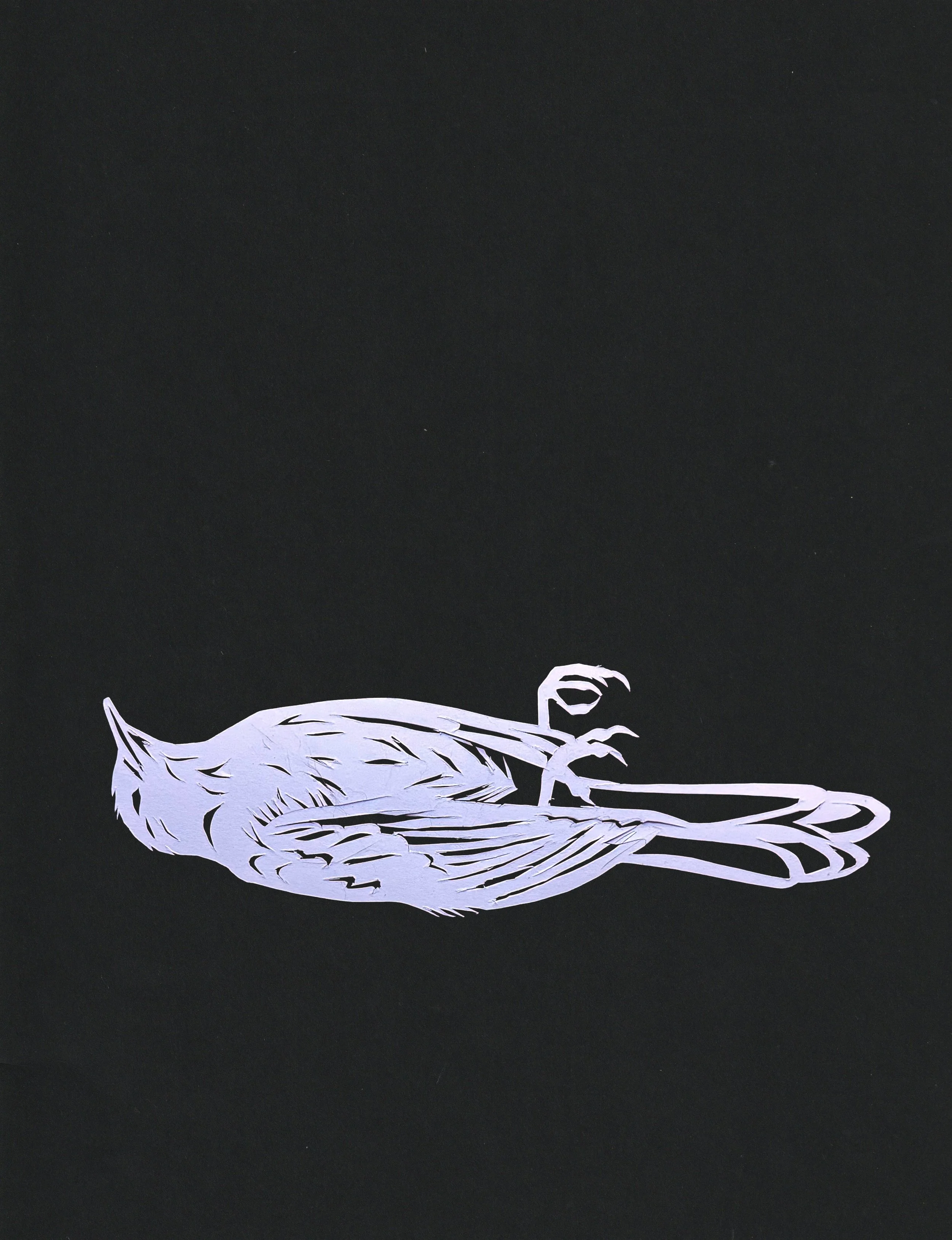 These paper cutouts are loosely based on photos of dead birds collected around a building infamous for causing bird deaths. The cutouts are as delicate as bird bodies. The people in that building are experimenting with films for their windows. They are trying their best.